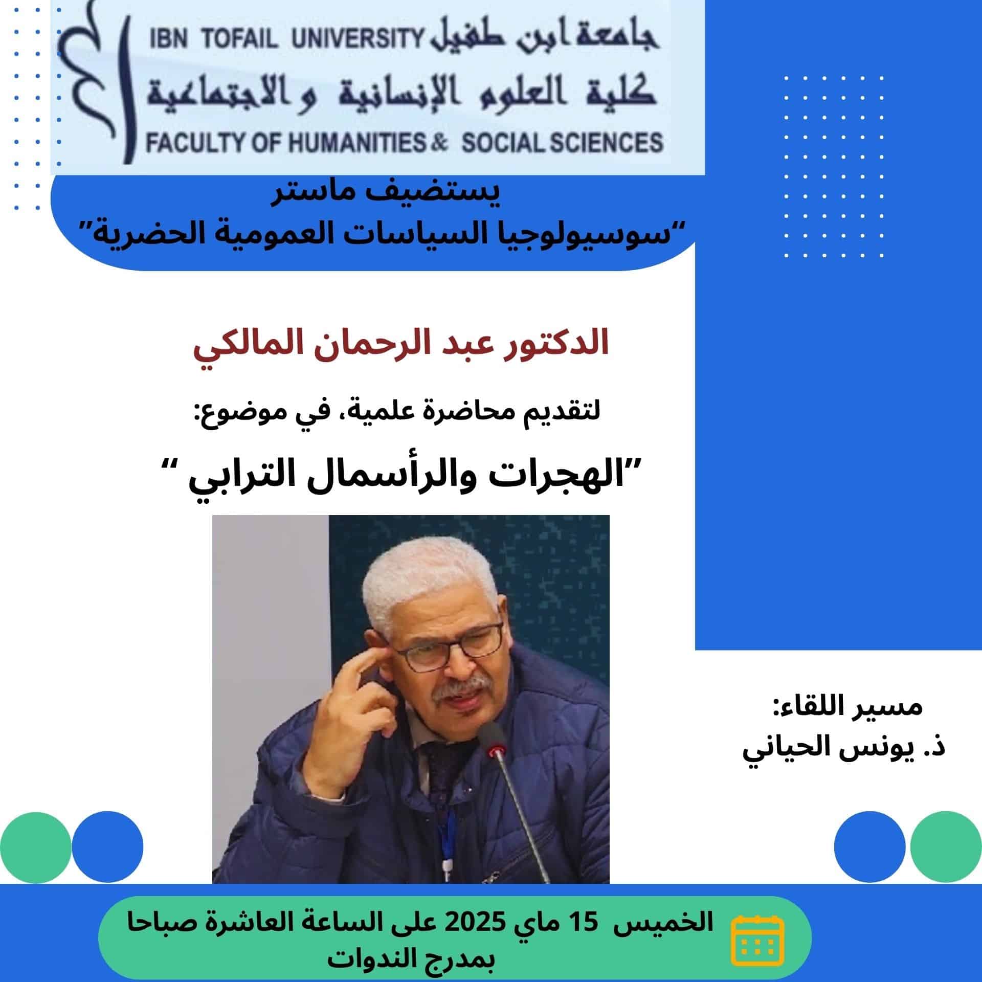 محاضرة في موضوع: الهجرات والرأسمال الترابييستضيف ماستر سوسيولوجيا السياسات العمومية الحضرية بكلية العلوم الإنسانية والاجتماعية، جامعة ابن طفيل محاضرة في موضوع: الهجرات والرأسمال الترابي