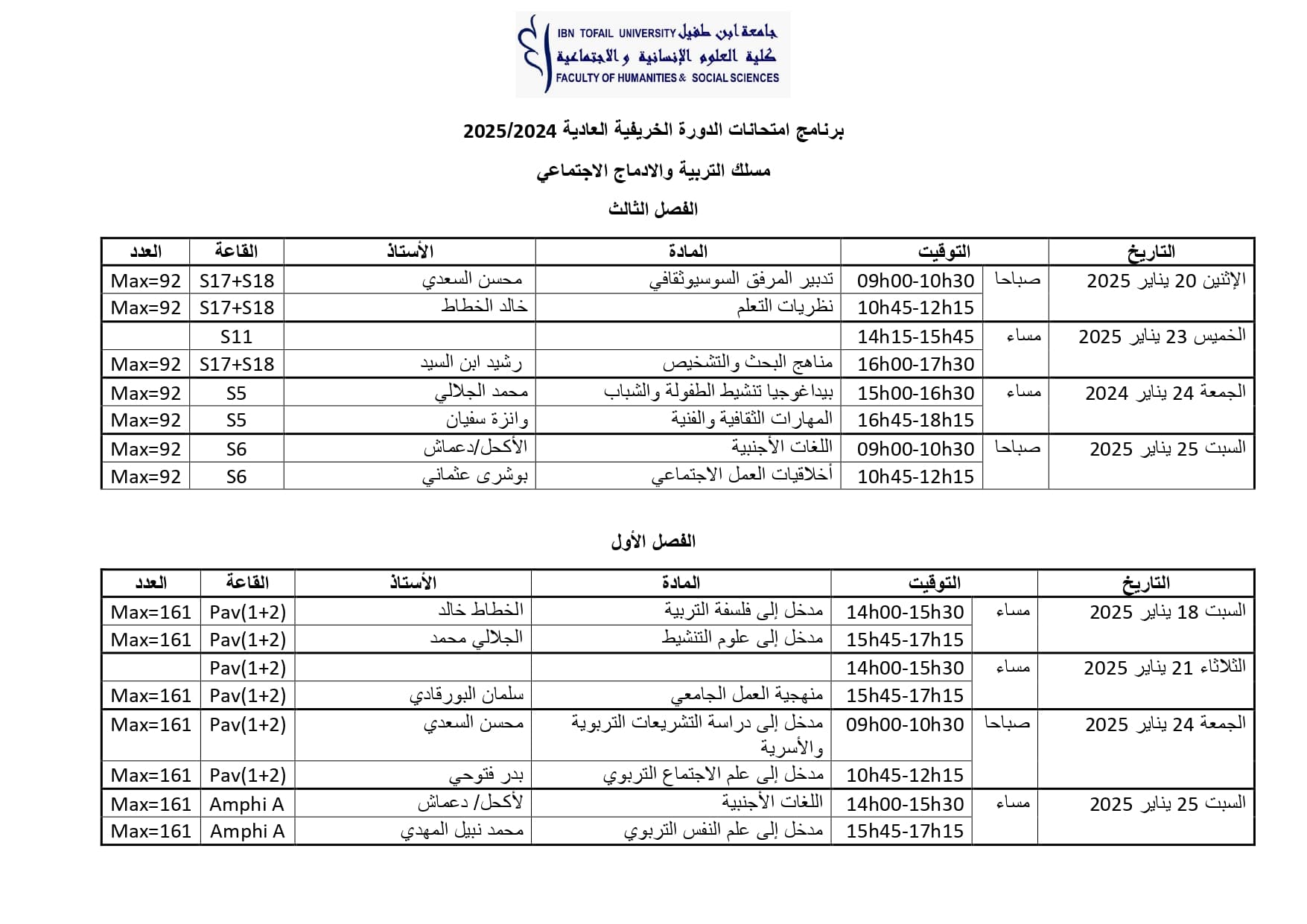 إعلان جدولة امتحانات الدورة الخريفية العادية لمسلك التربية والإدماج الاجتماعي