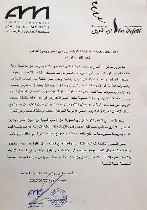 إعلان خاص بطلبة مسلك الإجازة المهنية في : مهن المسرح والفنون العرض شعبة الفنون والوسائط