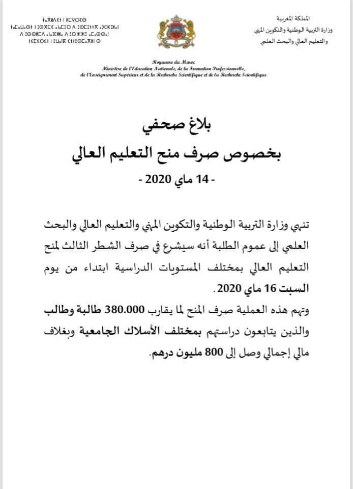 بلاغ صحفي بخصوص صرف منح التعليم العالي