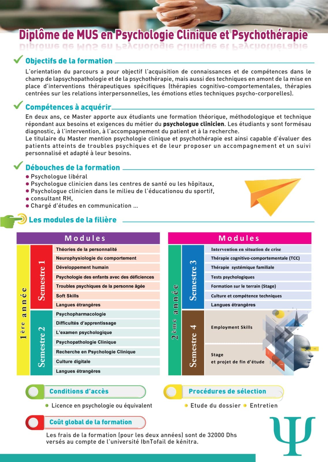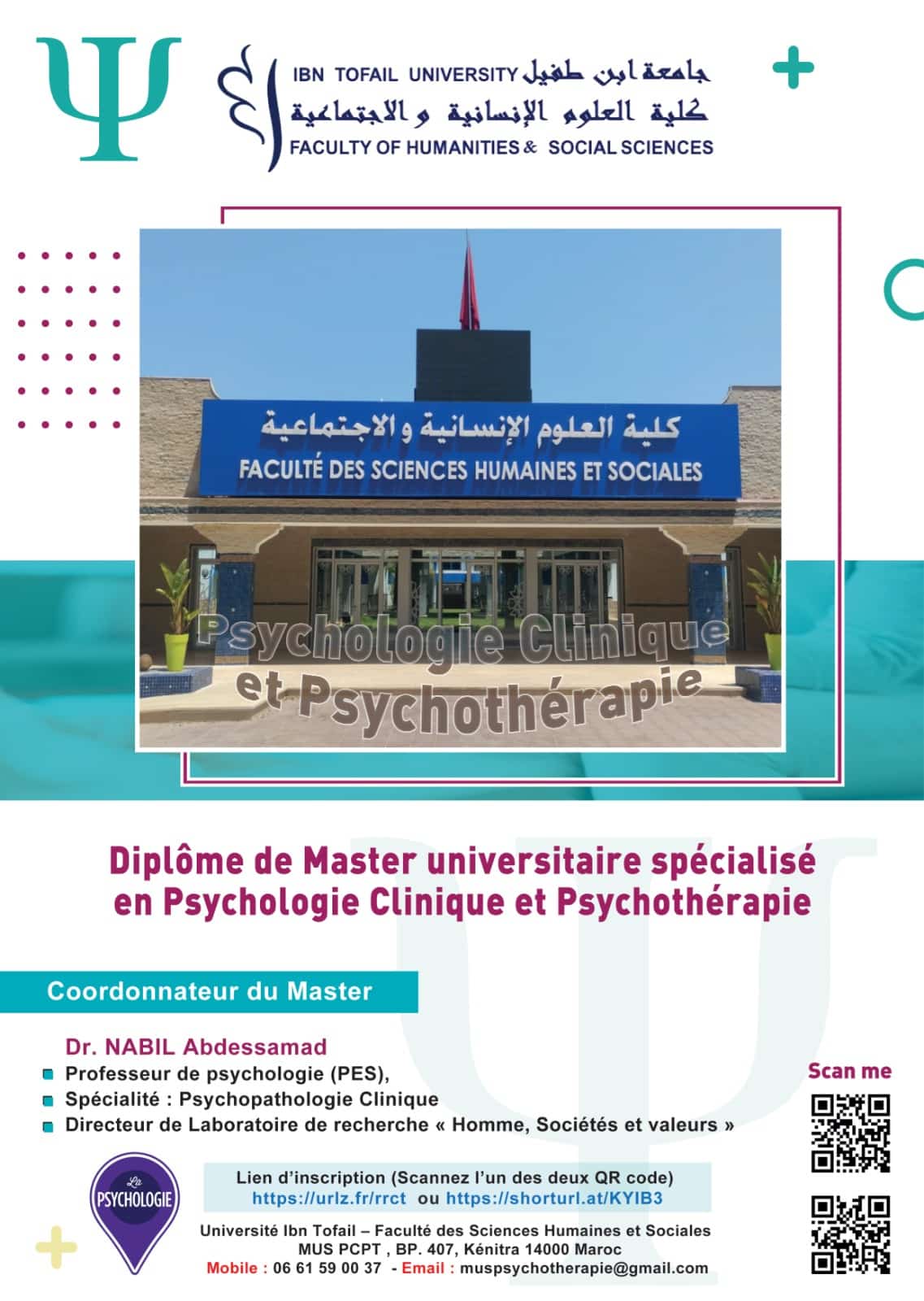 Le Coordinateur du Master de « Psychologie Clinique et Psychothérapie » à la Faculté des Sciences Humaines et Sociales de Kénitra porte à la connaissance des étudiants titulaires d’un Diplôme de Licence en psychologie ou d’un Diplôme reconnu équivalent que la candidature pour ce Master, au titre de l’année 2024-2025, aura lieu sur la plate-forme (voir le lien sur le Flyer).